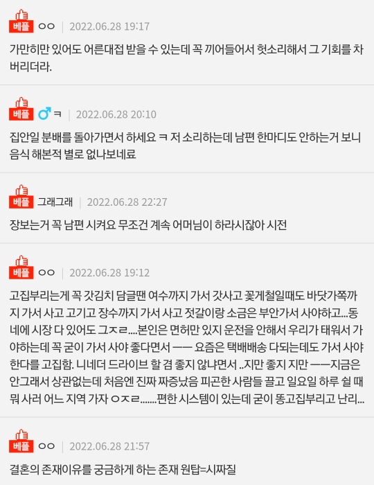 저도 짜증나서 남편한테 이제부턴 자기가 밥해~ 나머지는 내가 할게. 어머님 말씀대로 내일부터 시장에서 장 봐와 이렇게 말하니까 시어머니 얼굴 울그락붉그락 하시더라구요.