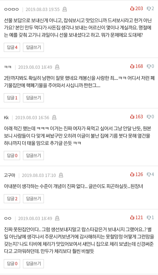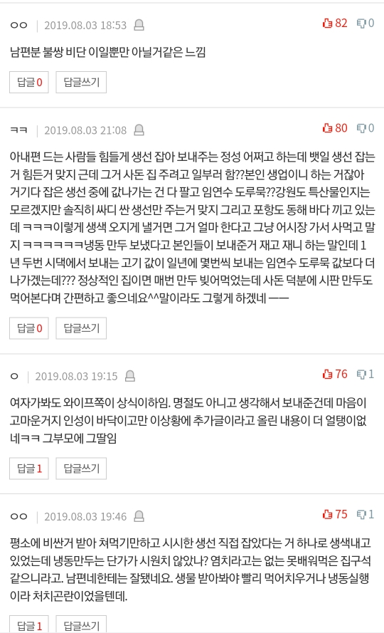 시어머니한테 연락이왔어"저희가 만두를 먹었는데 맛이 좋아서 사돈네도 드셔보셨으면 해서 보냈다""저희는 사돈네 처럼 생선을 잡아 보낼수 없어, 매번 생선 받은거 감사한 마음으로 보내니 맛있게 드셔 달라"