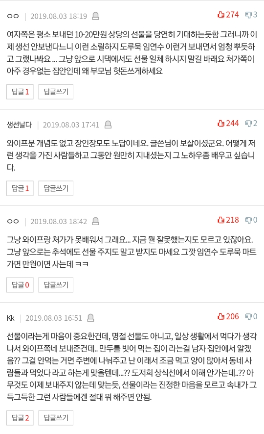 추석,설날에는저희 부모님은 예를 갖춰 10~20만원 상당의 소고기, 과일선물세트류 보내셨고장인장모님 께서도 추석/설에 매번 못챙겨 드리니 평소에 고기 잡으면 생선을 보내주는 그런 상황이었습니다.